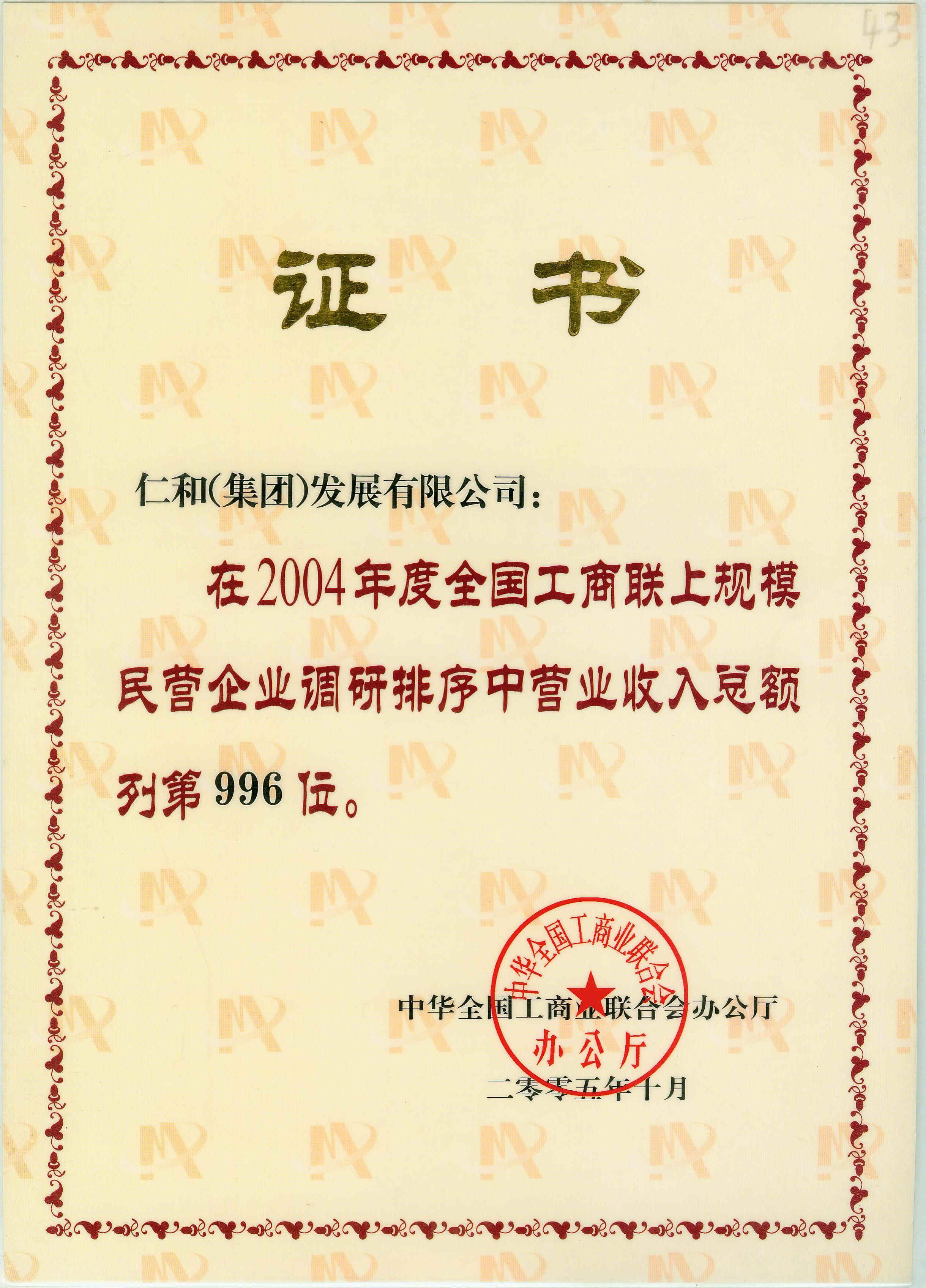 2004年度全國工商聯上規模民營企業調研排序中營業收入總額列第996位 發布時間: 2019年12月18日 14:39:53 閱讀量: 9,123 下一篇:2004年國家工商行政管理總局守合同重信用企業上一篇:2004年榮獲全國守合同重信用企業